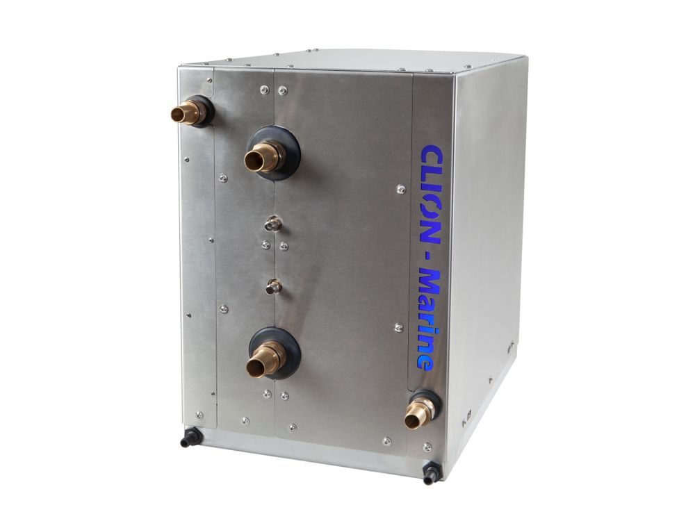 The Clion-Marine chiller package consists of the following items: chiller, complete prewired EMC protected control box and cable loom (0,8-1mtr), mounting kit control box (preinstalled at front of the chiller), touch screen display, Vimar black bezel, RJ45 cable 10 mtr.