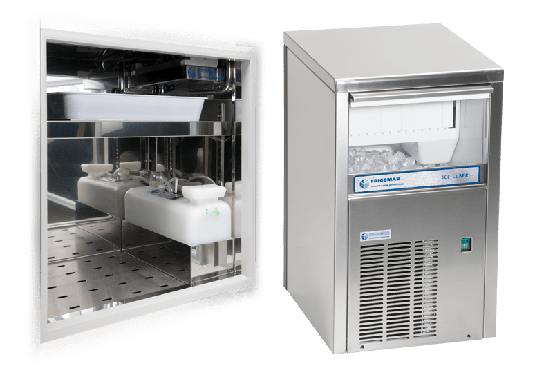 Ice Maker with built-in air-cooled group, connected drinking water system on board. It makes ice cubes, ice fingers or ice flakes.